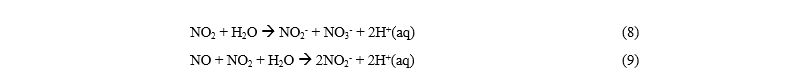 โดยที่ M คือโมเลกุลตัวกลางใดๆในปริมาตรพลาสมา ดังนั้นอนุมูลไนเตรต-ไนโตรเจนจึงถูกสร้างขึ้นในน้ำได้จากอนุมูล RONS ที่ละลายลงไปในน้ำ (สมการที่ 6-7) โดยผ่านปฏิกิริยาต่อไปนี้ (สมการที่ 8-9)