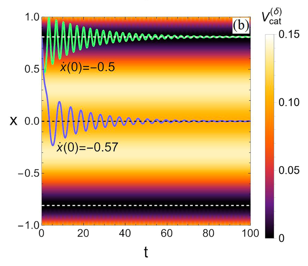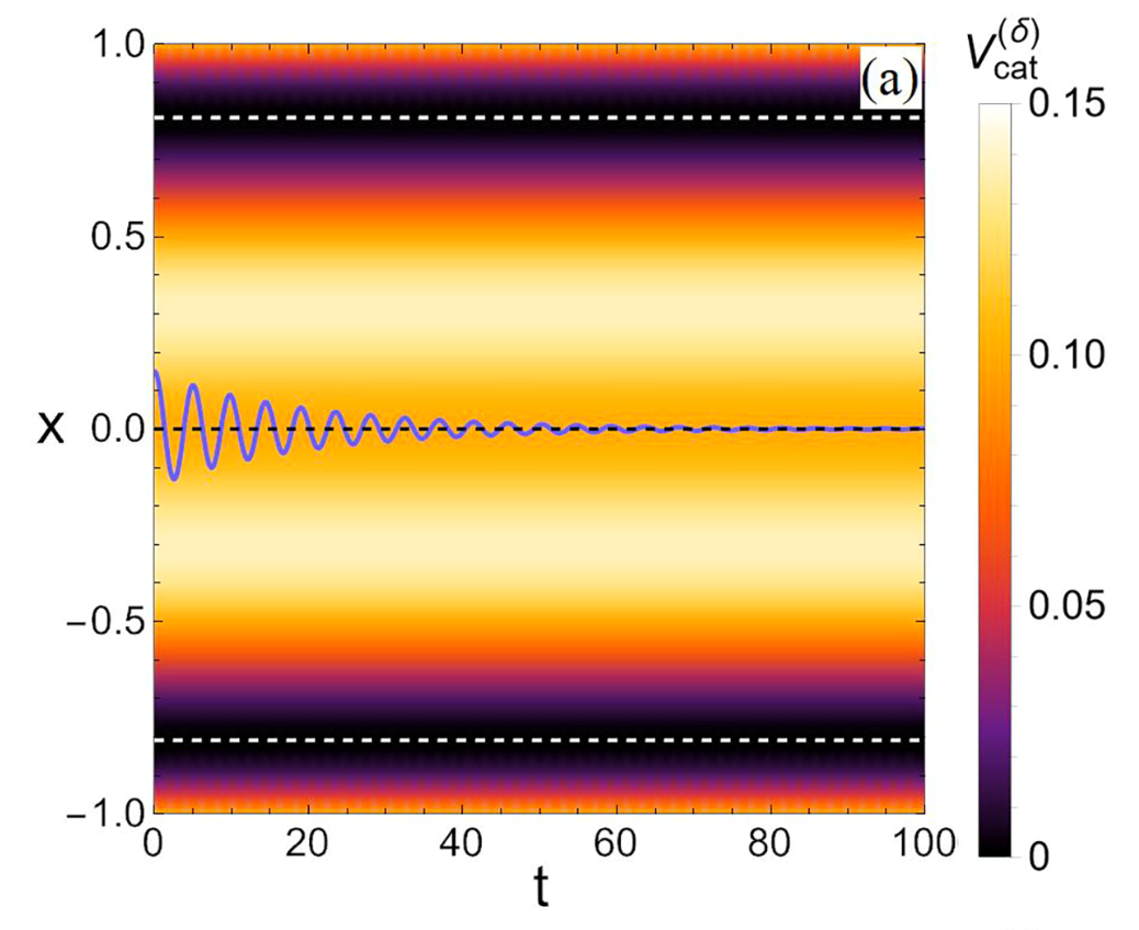 \(\left.\frac{d^2}{dx^2}V^{(δ)}_{cat}\right |_ {x=0} = \begin{cases} -2 &\text{if } {δ=0 }\\ 2 & \text{if } {δ>0 } \end{cases} \) .......สมการที่ 1