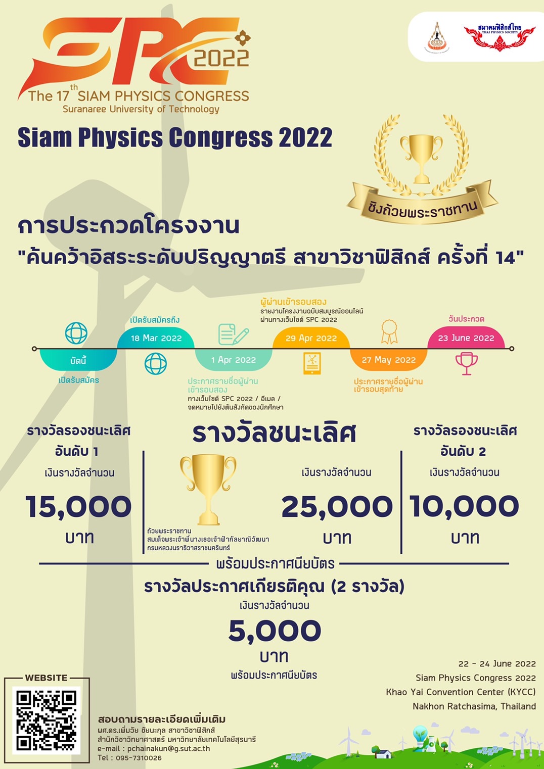 ขอเชิญชวนนิสิตนักศึกษาร่วมส่งประกวดโครงงาน “ค้นคว้าอิสระระดับปริญญาตรี สาขาวิชาฟิสิกส์ ครั้งที่ 14” ชิงถ้วยพระราชทาน ในงานประชุมวิชาการ Siam Physics Congress 2022 (SPC 2022)