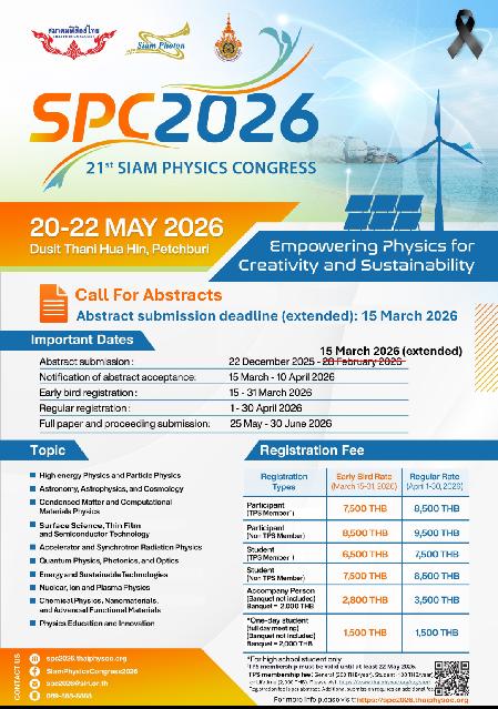 สมาคมฟิสิกส์ไทย ขอเชิญชวนนักวิจัย คณาจารย์ นักศึกษา และผู้สนใจด้านฟิสิกส์ เข้าร่วมการประชุมวิชาการ Siam Physics Congress 2026 (SPC 2026) ซึ่งมีกำหนดจัดขึ้นระหว่างวันที่ 20–22 พฤษภาคม พ.ศ. 2569 ณ Dusit Thani Hua Hin จังหวัดเพชรบุรี